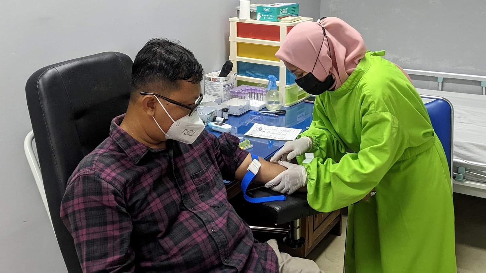 Ketua PWI Kebumen melakukan pemeriksaan gula darah di RSUD Dr Soedirman dalam rangka HPN 2023. (Foto: Hari)