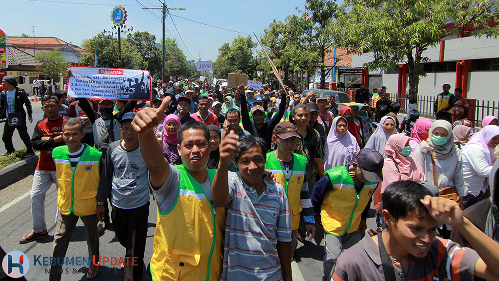 Kepala Dinas Perkim LH Kebumen Edi Rianto menemui para PKL yang menggelar aksi. (Foto: Padmo-KebumenUpdate)