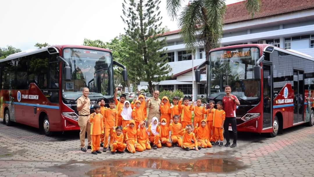 Anak-anak sekolah dasar berfoto di depan dua unit Bus Trans Kebumen. (Foto: Dok Humas Pemkab Kebumen)