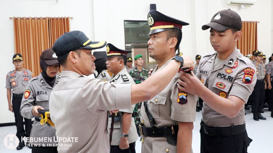 Kapolres Kebumen AKBP Rudy Cahya Kurniawan memasang tanda pangkat kepada Kapolsek Karanganyar AKP Kusnadi SH. (Foto: Humas Polres-KebumenUpdate)
