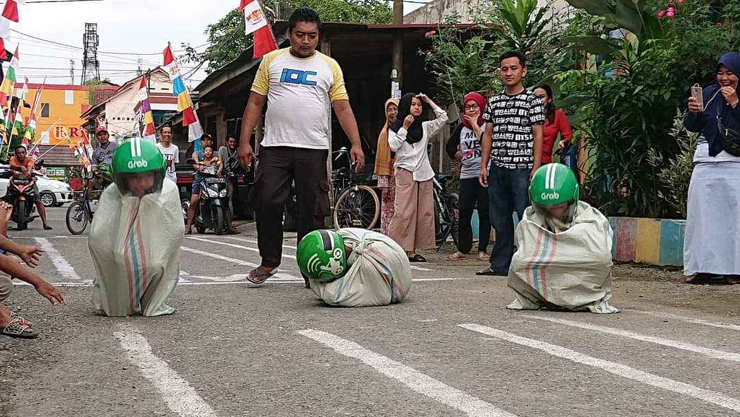 Lomba balap karung menggunakan helm. (Foto: Hari)