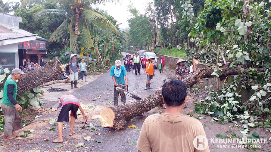 Pohon tumbang menimpa rumah Jaelani warga Desa Mangunweni, Kecamatan Ayah. Rumah yang baru setengah jadi itu rusak pada bagian atap dan tembok retak akibat tertimpa pohon jati.
