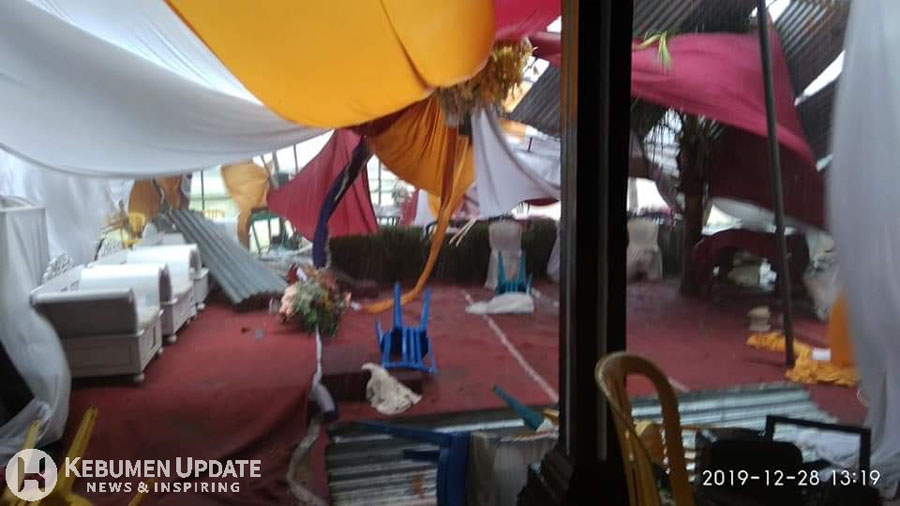 PURING (KebumenUpdate.com) – Hujan yang disertai angin kencang melanda sejumlah wilayah di Kebumen, Sabtu, 28 Desember 2019. Sejumlah rumah rusak akibat tertimpa pohon tumbang, termasuk menjadi “tamu tak diundang” yang menghancurkan tenda resepsi pernikahan.